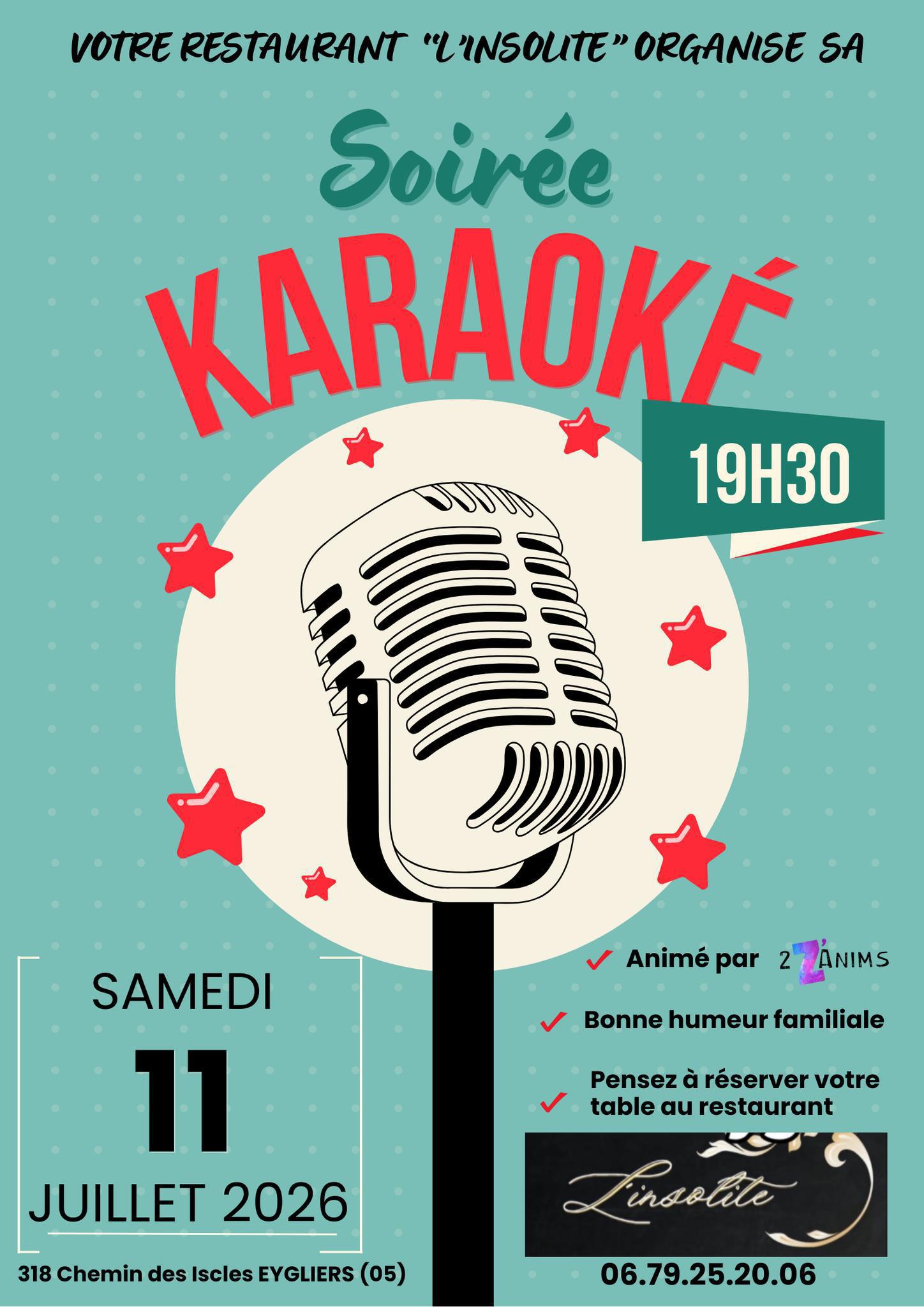 Soirée KARAOKE avec les 2 Z'anims à partir de 19h30 ! L'occasion de venir partager un bon moment en famille, entre amis ! Pensez à réserver votre table ! Ambiance décontractée !